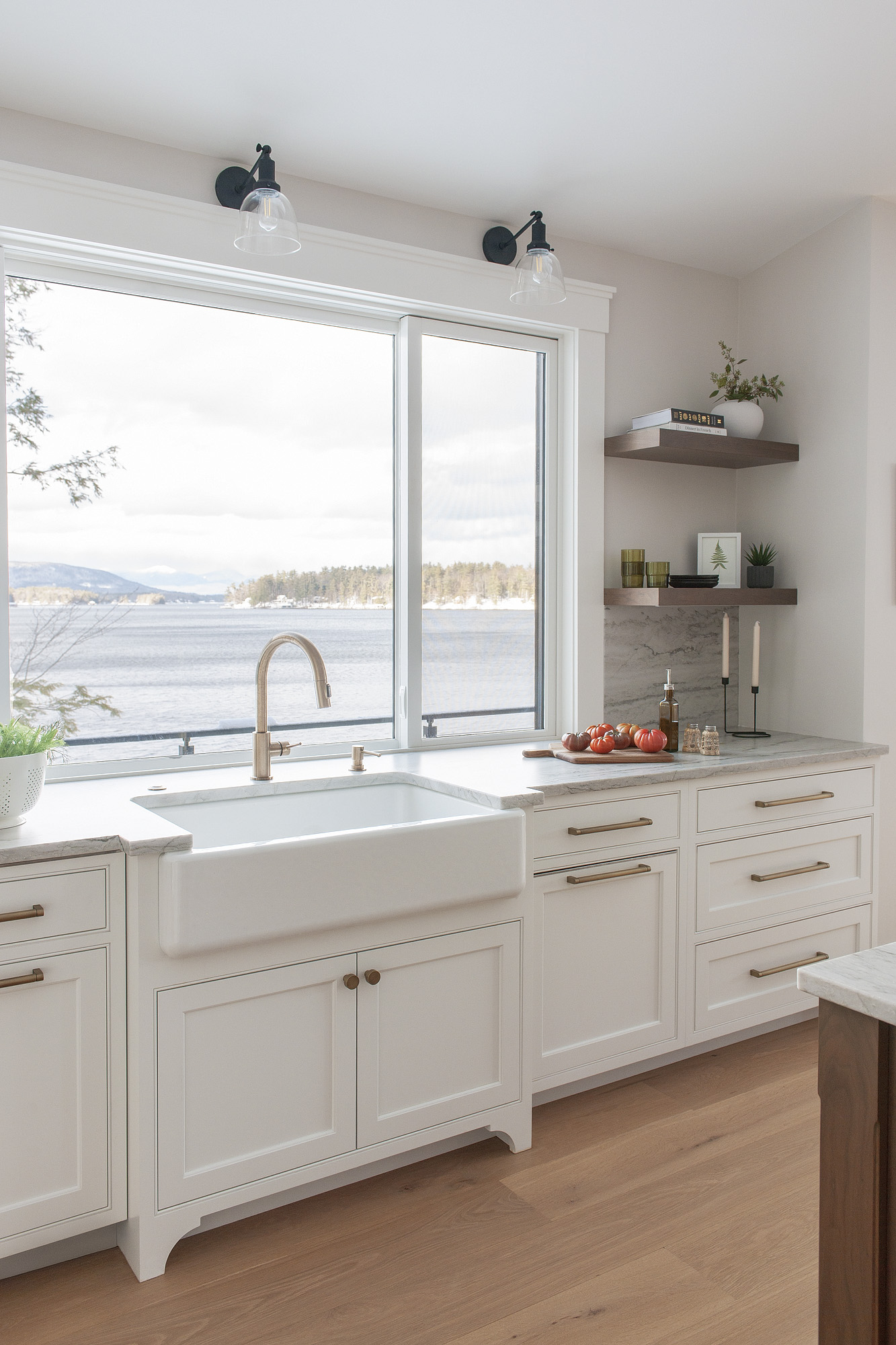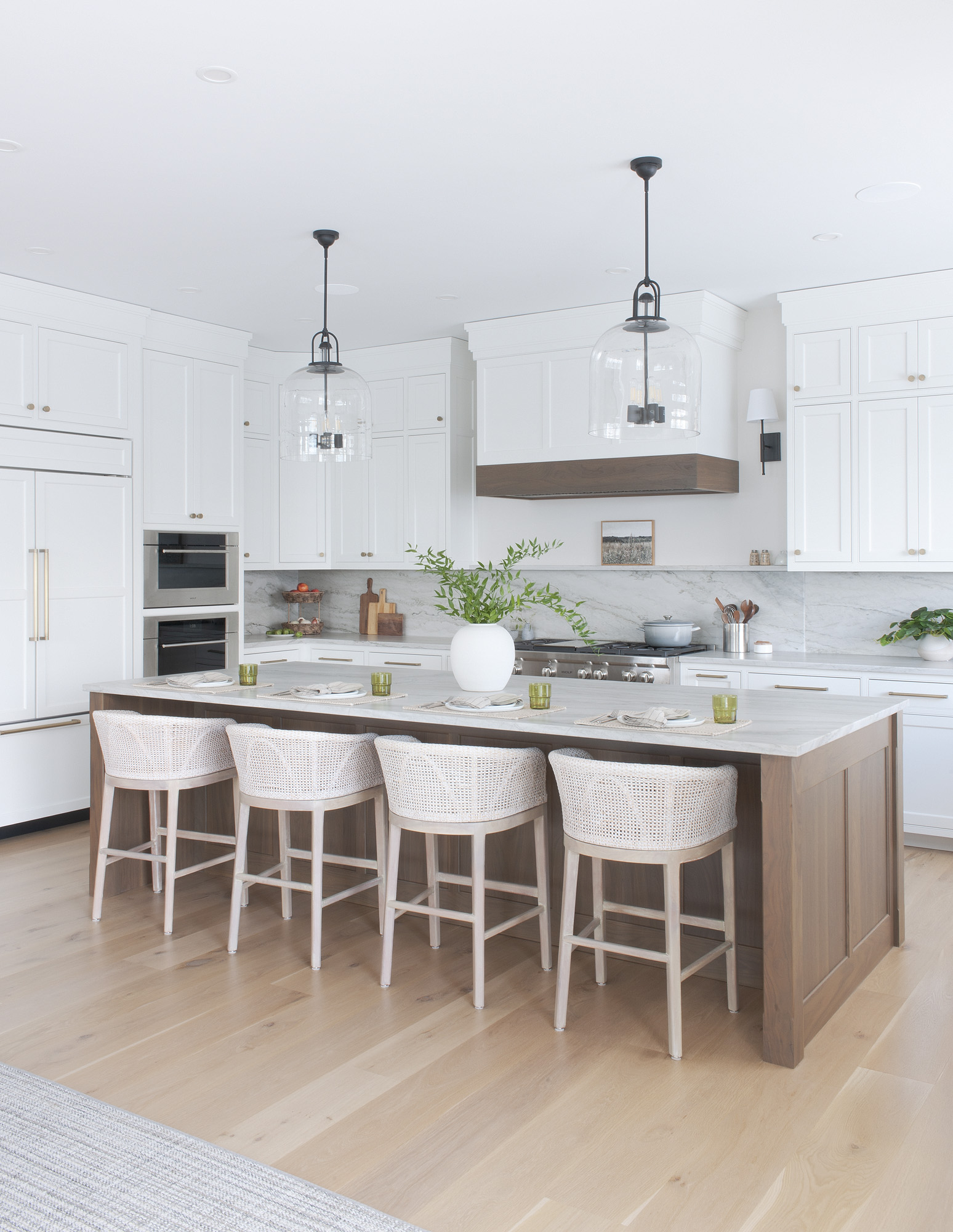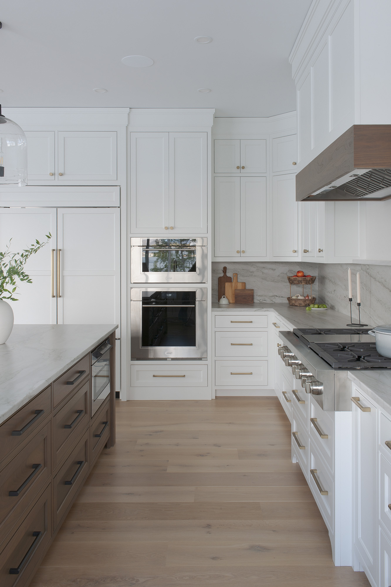 ISLAND and RANGE HOOD Wood : Clear Walnut; Stain Color : Weathered (toned); Door Style : Newport; Face Frame : Beaded Inset; PERIMETER Wood : Maple; Paint Color…