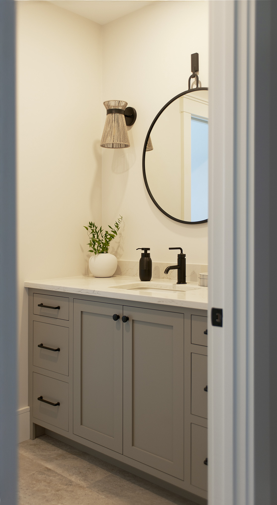 Vanity from Crown Select Wood: Maple; Paint Color: Pavestone; Door Style: Cornish; Face Frame: Square Inset